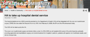 Starting from February 6th, the Hospital Dental Services (HDS) originally provided by the Hong Kong Department of Health will be officially transferred to the Hong Kong Hospital Authority (HA) and integrated with the existing Oral and Maxillofacial Surgery Services (OMS).